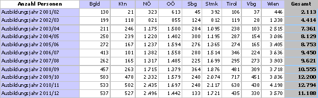 Die nachstehende Auswertung des Arbeitsmarktservice beginnt daher mit dem Ausbildungsjahr 2001/02 und stellt nicht auf „Lehrstellen“ ab, sondern erfasst die Anzahl jener Personen, die im jeweiligen Ausbildungsjahr an Ausbildungslehrgängen teilnahmen. Im Sinne der Zielsetzung, auch die TeilnehmerInnen an Ausbildungslehrgängen ehestmöglich auf betriebliche Lehrstellen zu vermitteln, werden freie „Ausbildungsplätze“ nachbesetzt.