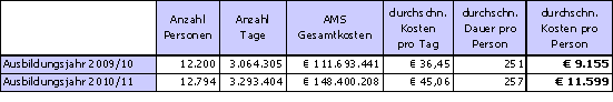 Die Kosten des Arbeitsmarktservice (einschließlich Ausbildungsbeihilfen) beliefen sich pro TeilnehmerIn im Ausbildungsjahr 2009/10 auf durchschnittlich € 9.155,00 und im Ausbildungsjahr 2010/11 auf durchschnittlich € 11.600,00.