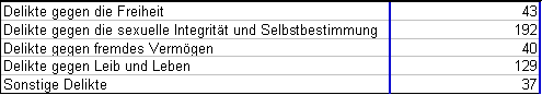 Die Untergebrachten gemäß § 21 Abs. 2 StGB teilen sich zum Stichtag wie folgt auf die in der Integrierten Insassenverwaltung (IVV) hinterlegten führenden Deliktsklassen auf (eine Aufgliederung nach Hauptstücken des StGB ist nicht hinterlegt und würde unverhältnismäßigen Aufwand verursachen):