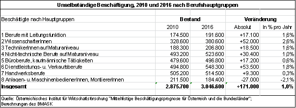 Als Grundlage für die Prognose der Entwicklung der einzelnen Berufsgruppen dient die mittelfristige Prognose der Beschäftigungsentwicklung nach Berufsgruppen des österreichischen Instituts für Wirtschaftsforschung: „Mittelfristige Beschäftigungsprognose für Österreich und die Bundesländer 2010 bis 2016“. Die nachstehende Tabelle zeigt die Entwicklung bis 2016. Für die Trendabschätzung bis 2020 wurde die Gesamtentwicklung des Fachkräftebedarfs entsprechend fortgeschrieben, für den Zeitraum ab 2016 liegen jedoch noch keine detaillierten Prognosen nach den jeweiligen Berufsgruppen vor.