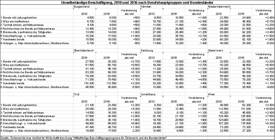 Die Abschätzung der Berufsgruppen nach Bundesländern beruht auf der Prognose der Beschäftigungsentwicklung nach Berufsgruppen des österreichischen Instituts für Wirtschaftsforschung: „Mittelfristige Beschäftigungsprognose für Österreich und die Bundesländer 2010 bis 2016“. Die nachstehende Tabelle zeigt die Entwicklung bis 2016. Für den Zeitraum ab 2016 liegen noch keine detaillierten Prognosen nach Bundeländern und Berufsgruppen vor.