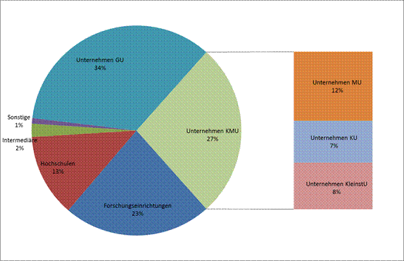Im Zeitraum 2004 bis 2012 haben 7.312 Unternehmen eine Förderung der FFG erhalten, davon 6.224 KMU, das heißt: 85 % aller Unternehmen, die FFG-Förderungen erhalten sind KMU. Dieser Anteil entspricht somit genau dem Anteil von KMU an den Forschung und Entwicklung durchführenden Unternehmen in Österreich.