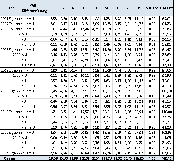 Tabelle: Förderungen an KMU nach Jahr und Bundesland in Mio. € (Stichtag 25.9.2012)