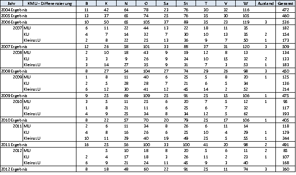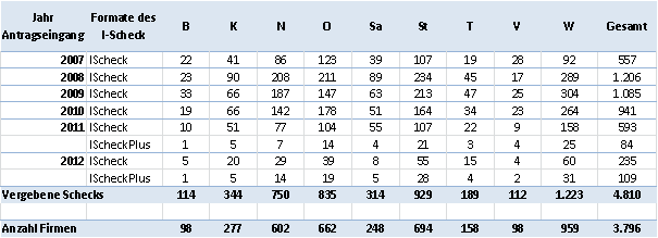 Die nachstehende Tabelle enthält die Anzahl der Unternehmen, die im Zeitraum 2004 bis September 2012 Basisprogrammförderung erhalten haben. Diese Unternehmen werden unabhängig von der Anzahl der geförderten Anträge und unabhängig vom Jahr nur einmal gezählt.