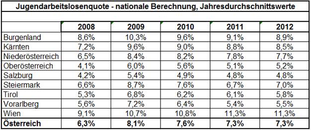 Laut der aktuellen Arbeitsmarktprognose des Forschungsinstituts Synthesis wird die Arbeitslosigkeit von Jugendlichen bis 19 Jahren im Jahresdurchschnitt 2012 österreichweit um 100 bzw. +1,2 % ansteigen. Für das Jahr 2013 wird für diese Altersgruppe keine weitere Zunahme erwartet.