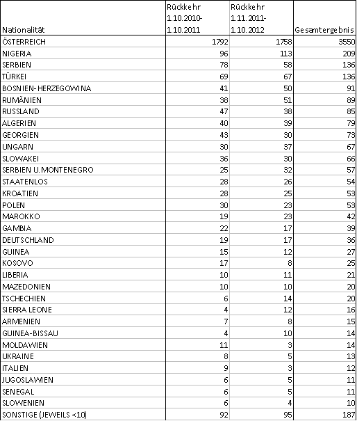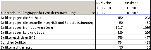 Die Daten über die in den Justizanstalten inhaftierten Personen, wie sie in der Integrierten Vollzugsverwaltung (IVV) enthalten sind, ermöglichen jedoch die Erstellung einer Wiederkehrerstatistik bezogen auf Personen, die in den beiden Jahren vor dem Stichtag 1. Oktober 2012 zur Verbüßung einer weiteren Haft (keine reine Untersuchungshaft oder Anhaltung) eingeliefert wurden und bereits zuvor im Zeitraum ab 1.1.2001 Haft in Österreich verbüßt hatten (Doppelzählungen möglich).
