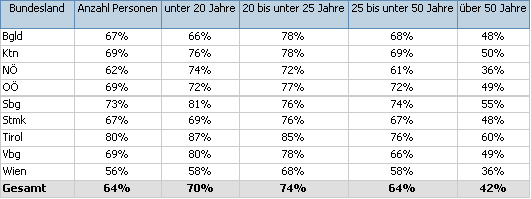 Die nachfolgende Tabelle (3) liefert eine prozentuelle Darstellung der Ergebnisse (Tabelle 2) bezogen auf die Grundgesamtheit (Tabelle 1):
