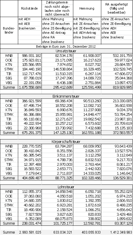 Nachfolgend werden die fälligen Rückstände an Umsatzsteuer, Einkommensteuer, Körperschaftsteuer und Lohnsteuer des Jahres 2012 zum Stichtag 31. Dezember 2012 nach Bundesländern aufgegliedert dargestellt.