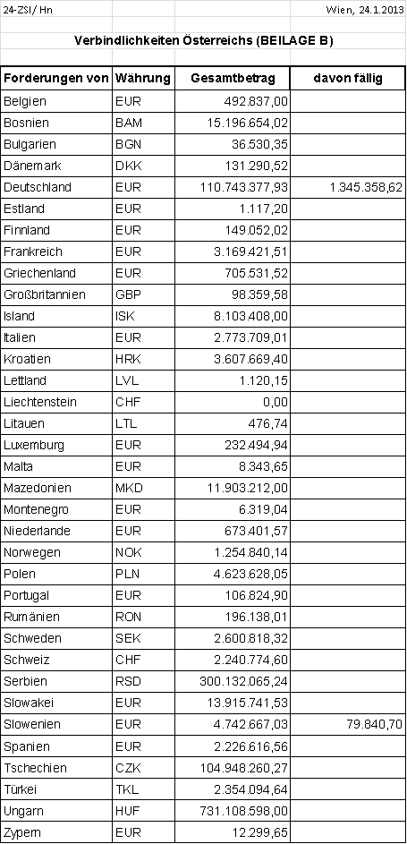 Ich verweise dazu auf die vom Hauptverband übermittelte Aufstellung über die Verbindlichkeiten der österreichischen Krankenversicherungsträger im Verhältnis zu den EU-Mitgliedstaaten, EWR-Staaten, der Schweiz und den Vertragsstaaten zum Stand 24. Jänner 2013 (Beilage B).