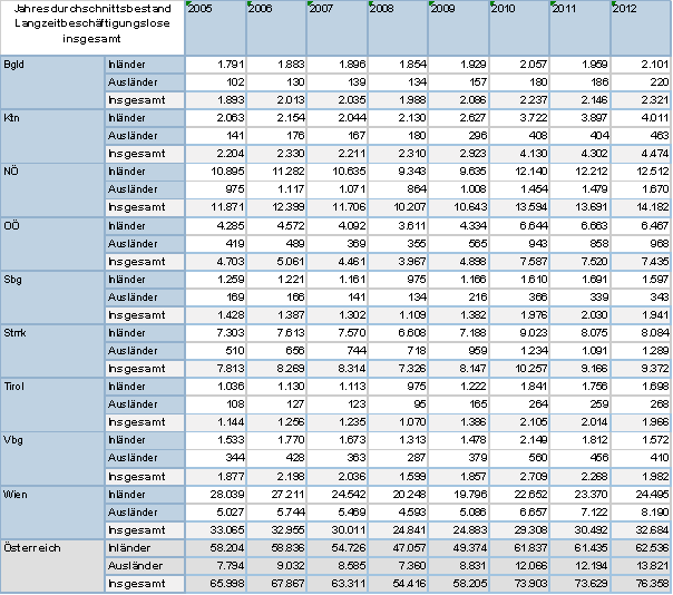 Mit dem Indikator der Langzeitbeschäftigungslosigkeit (LZBL) wurde vom Arbeitsmarktservice ein alternatives Konzept zur Erfassung von Problemen im Hinblick auf eine dauerhafte Wiedereingliederung in den Arbeitsmarkt entwickelt. Eine Person ist langzeitbeschäftigungslos, wenn die Summe der (Netto-)Dauer von Arbeitslosigkeit, Lehrstellensuche und Schulungsteilnahme ein Jahr überschreitet. Unterbrechungen, wie zum Beispiel auch Beschäftigungszeiten, bis zu 62 Tage führen nicht zum Ende der Langzeitbeschäftigungslosigkeitsepisode. Langzeitbeschäftigungslose Personen haben zwar Probleme im Hinblick auf eine nachhaltige Wiedereingliederung in den Arbeitsmarkt, sie sind in der Regel jedoch nicht durchgehend arbeitslos oder in Schulung.
