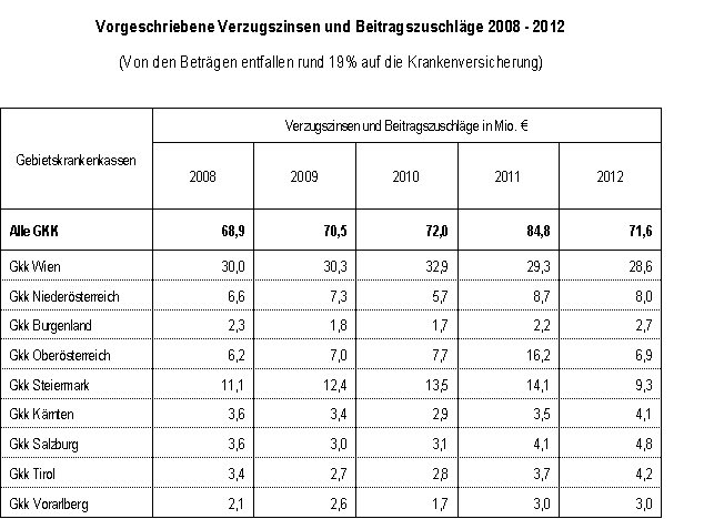 Österreichweit werden rund 97 bis 98 % der Beiträge so rechtzeitig bezahlt, dass keine Mahnungen erforderlich sind. Beispielsweise hatte die NÖGKK im Jahr 2011 eine Einbringungsquote von 99,67 %. Bei der StGKK werden ca. 94 % der Sozialversicherungsbeiträge innerhalb der Einzahlungsfrist entrichtet. Von den gemahnten Beiträgen ist etwa ein Viertel (also weniger als 1,5 % der vorgeschriebenen Beiträge) zu exekutieren. Unter Berücksichtigung aller Möglichkeiten der Beitragseinhebung beträgt die Einbringungsquote bei der StGKK über 99 %.
