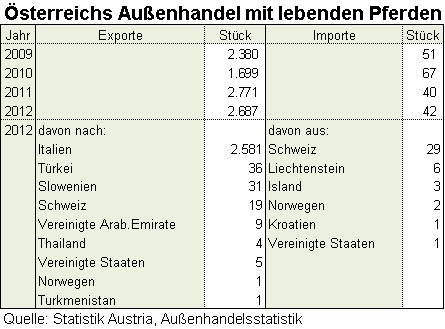 Im Jahr 2012 wurden 2.687 Pferde exportiert und 42 Stück importiert. Der größte Teil der Exporte ging nach Italien.
