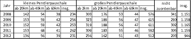 Nachfolgender Tabelle ist die Verteilung der Beträge des großen und kleinen Pauschales auf Einkommensklassen zu entnehmen. Die im aktuellen Datenmaterial im Jahr 2012 ersichtliche Verschiebung der höchsten Besetzungen in Richtung niedrigerer Einkommensklassen ist insbesondere auf den für das Veranlagungsjahr 2012 noch niedrigen Veranlagungsgrad zurückzuführen. Es kann davon ausgegangen werden, dass sich nach vollständiger Veranlagung auch im Jahr 2012 ein ähnliches Bild wie in den Vorjahren zeigen wird.