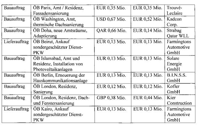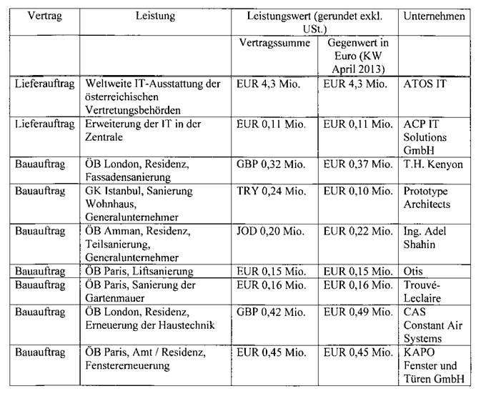 Im In- und Ausland sind im Zeitraum 1. Jänner 2012 bis zum Zeitpunkt der Anfrage folgende Aufträge mit einem Leistungswert von mehr als 100.000 Euro in einem Verfahren mit mehreren Unternehmern nach dem Bundesvergabegesetz 2006 vergeben worden: