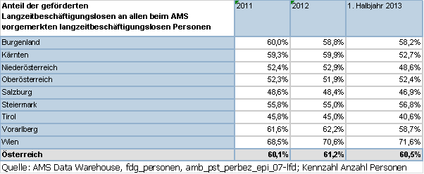 Der Anteil der vom AMS geförderten Langzeitbeschäftigungslosen an allen vorgemerkten Langzeitbeschäftigungslosen liegt im Jahr 2011 bei 60,1%, 2012 bei 61,2% und im 1. Halbjahr 2013 bei 60,5%. Damit erfolgt die Einbeziehung dieser Personengruppe in aktive arbeitsmarktpolitische Maßnahmen aktuell in ähnlichem Ausmaß wie für die BMS-BezieherInnen im AMS.
