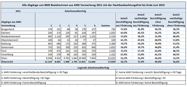 Von allen 2011 aus einem AMS‑Vormerkstatus abgegangenen BMS‑BezieherInnen haben bis Mitte 2013 rund 54% eine Arbeitsaufnahme (absolut 28.913) zu verzeichnen, gut 2/3 davon waren nachhaltige Arbeitsaufnahmen von mehr als 3 Monaten durchgehender Beschäftigungsdauer (20.124 oder insgesamt rund 37% aller Abgänge).