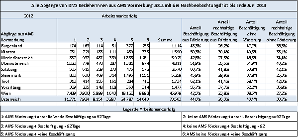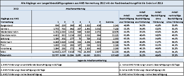 Von den im Jahr 2012 aus einem AMS‑Vormerkstatus abgegangenen Langzeitbeschäftigungslosen (LZBL) haben bis Mitte 2013 bereits rund 51% eine Arbeitsaufnahme (absolut 60.107) zu verzeichnen, rund 70% davon waren wiederum nachhaltige Arbeitsaufnahmen von mehr als 3 Monaten durchgehender Beschäftigungsdauer (41.843 oder insgesamt rund 36% aller Abgänge). Der Nachbeobachtungszeitraum bis Mitte 2013 ist faktisch kürzer als der der Abgangskohorte 2011, was auch beim Vergleich der Ergebnisse zu berücksichtigen ist.