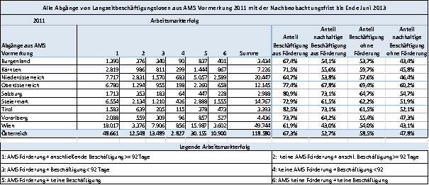 Von allen 2011 aus einem AMS-Vormerkstatus abgegangenen Langzeitbeschäftigungslosen (LZBL) haben bis Mitte 2013 rund 65% eine Arbeitsaufnahme (absolut 77.525) zu verzeichnen, rund 79% davon waren nachhaltige Arbeitsaufnahmen von mehr als 3 Monaten durchgehender Beschäftigungsdauer (61.209 oder insgesamt rund 52% aller Abgänge). Zur Definition der Langzeitbeschäftigungslosigkeit siehe Beantwortung Frage 8.