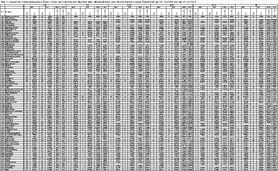 Darüber hinaus wird darauf hingewiesen, dass die Ermittlung der Ärztedichte in Form von Einwohner/inne/n pro niedergelassener Ärztin/niedergelassenem Arzt die Versorgungs-Realität nur sehr eingeschränkt abbildet, weil die tatsächliche Versorgungswirkung der einzelnen niedergelassenen Ärztinnen und Ärzte dabei nicht berücksichtigt werden kann.