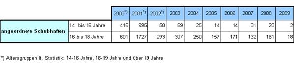Die Anzahl der gegenüber Minderjährigen ab dem 14. Lebensjahr verhängten Schubhaften stellt sich für den Zeitraum 2000 bis April 2009 wie folgt dar: