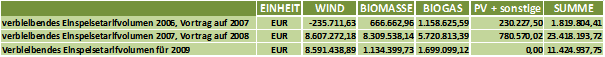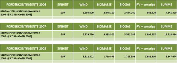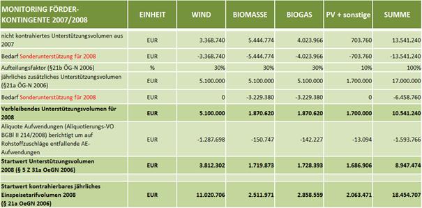 Das für neue, zusätzliche Ökostromanlagen maximal kontrahierbare Unterstützungsvolumen, definiert als Differenz der für die geförderten Ökostromanlagen festgelegten Einspeisetarifvolumina zu den niedrigeren Marktpreisen zuzüglich Aufwendungen für Ausgleichsenergie, Technologiefördermittel und Verwaltung, betrug gemäß Ökostromgesetz in den Jahren 2007 und 2008 das Ausmaß von jeweils € 17 Mio. (darin nicht enthalten ist Kleinwasserkraft). Diese sind über die festgelegte Einspeisetarif-Garantiedauer von 11,25 Jahren zu gewähren, wodurch sich auf dieser Basis ein Gesamtfördervolumen von rund € 190 Mio. an Verbindlichkeiten für neue zusätzliche Ökostromanlagen ergibt (vorbehaltlich etwaiger Degressionseffekte bei sinkendem Marktpreis).