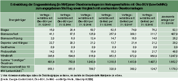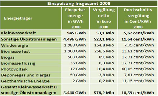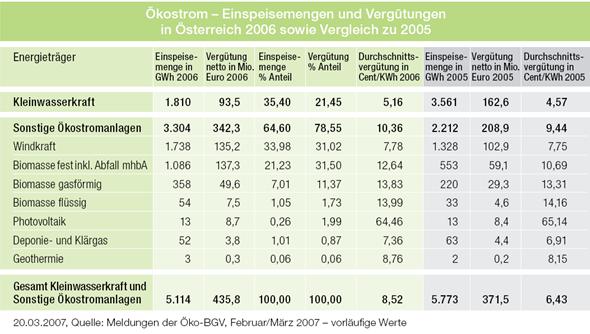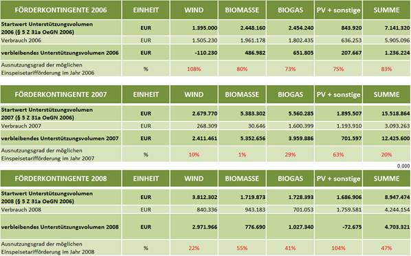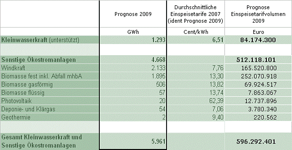 Gemäß Ökostrombericht der Energie-Control GmbH ergänzt mit Daten für 2008 sind die Einspeisetarifvolumina, Strommengen und installierte Engpassleistungen wie folgt: