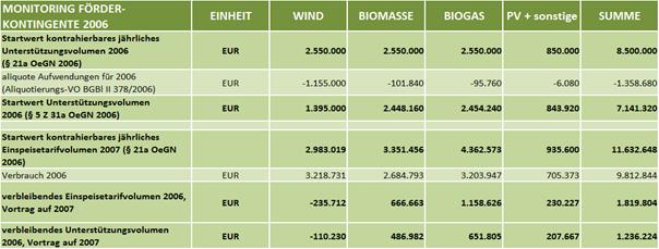 Ein negativer Wert, wie etwa bei Photovoltaik im Jahr 2008, bedeutet, dass in diesem Jahr die Menge des seitens der Ökostromabwicklungsstelle neu zu kontrahierenden Ökostroms aus Photovoltaikanlagen aufgrund von systemimmanenten Berechnungsdifferenzen höher war als das in diesem Segment verfügbare Unterstützungsvolumen. Die Überziehung des Kontingents wurde im nächsten Jahr ausgeglichen.