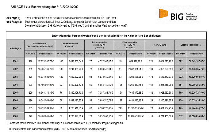 Die Entwicklung der Personalkosten der BIG wurde bereits in der Beantwortung der parlamentarischen Anfrage 946/J dargestellt. In der nachstehenden Tabelle erfolgt nunmehr zusätzlich eine Aufgliederung der Mitarbeiter/innen des BIG-Konzerns nach „BIG-KV“ und „ehemalige Vertragsbedienstete des Bundes“. Anzumerken ist, dass die ehemaligen Vertragsbediensteten des Bundes vor allem Mitarbeiter/innen im handwerklichen Bereich des Facility Services und Assistenzkräfte umfassen und daher die durchschnittlichen Personalkosten entsprechend geringer sind.