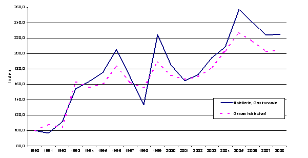 Die Grafik zeigt weiters, dass die Tourismuswirtschaft (Hotellerie und Gastronomie) die Entwicklung der Gesamtwirtschaft mitmacht und keineswegs einen überdurchschnittlichen Anteil am Gesamtinsolvenzgeschehen hat. Im Jahr 2008 haben die Insolvenzzahlen in der Gesamtwirtschaft um 8 % im Vergleich zum Vorjahr zugenommen, während Hotellerie und Gastronomie lediglich eine Zunahme von 0,3 % zu verzeichnen hatten. Die Krise hat im vergangenen Jahr die Tourismusbranche nur in sehr geringem Ausmaß getroffen, nachdem die vergangene Sommersaison sehr erfolgreich verlaufen ist und auch das Winterergebnis im Wesentlichen zufriedenstellend war.