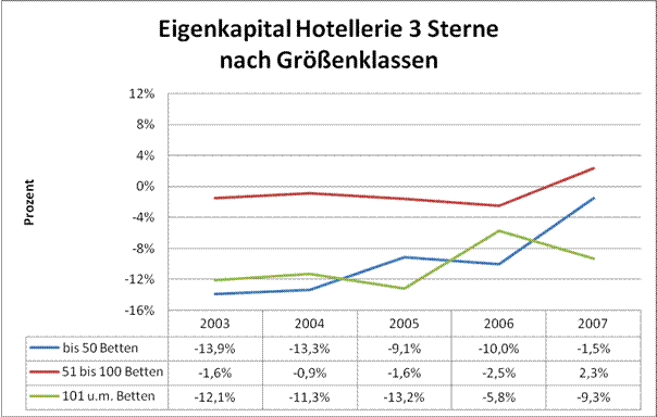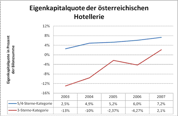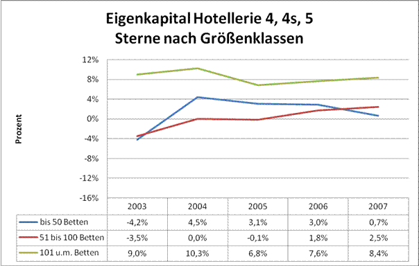 Die nachstehenden Grafiken zeigen die Entwicklung der Eigenkapitalsituation (Eigenkapitalquote in % der Bilanzsumme) in der Hotellerie sowie eine Auswertung der Daten nach Kategorien und Größenklasse. Zahlen liegen derzeit nur bis zum Jahr 2007 vor. Für die Gastronomie liegt eine ähnliche Entwicklung vor, aufgrund der zu geringen Grundgesamtheit werden die diesbezüglichen Zahlen der ÖHT nicht publiziert.