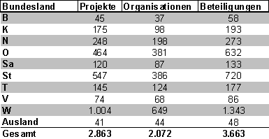 Anmerkung: An einem Projekt können mehrere Organisationen beteiligt sein; zählt man in jedem Projekt alle teilnehmenden Organisationen erhält man die Anzahl der Beteiligungen.