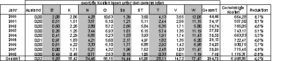 · Bezugsgröße für den Wert der Reduktion anerkennbarer Kosten, sind die ursprünglich genehmigten Kosten von Projekten. In Summe (2000 bis 2008) führte die Reduktion zu einer Differenz von 294,8 Mio. €, oder 4,2% im Anfragezeitraum. Allerdings ist auch hier das Ergebnis durch die noch ausständigen Revisionen für Projekte insbesondere der letzten 3 Jahre im Fluss.