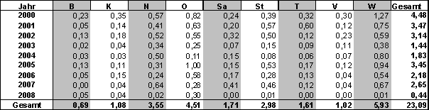 Anmerkung: Als Zuordnungskriterium wurde das Jahr der Projektgenehmigung herangezogen. Da Projekte aus den Jahren 2005 bis 2008 noch laufen (punktuell auch davor) wird es für diese Jahre noch Veränderungen im Sinne von steigenden Ausfällen geben.