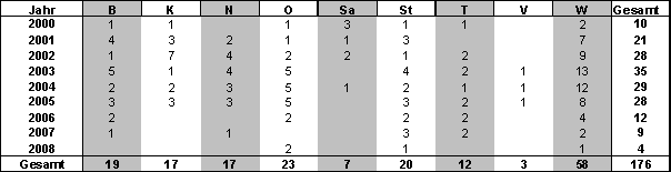 · Die Darstellung der Schadensfälle nach Jahr und Bundesland stellt somit in Summe 176 Fälle dar und lässt die Aussage zu, wie viele der geförderten Organisationen eines Jahres zum Schadensfall wurden.