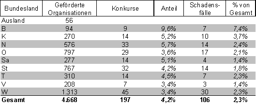 · 4,2% der Organisationen die im Zeitraum von 2000 bis 2008 geförderte Projekte betrieben haben sind in Konkurs. Zu finanziellem Schaden im Sinne des Ausfalls von Darlehen und Haftungen wurden 2,3% der geförderten Organisationen.