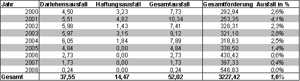 · Von den 4.668 Organisationen, die in den Jahren 2000 bis 2008 Zusagen erhalten haben, sind aus aktueller Sicht 106 in Insolvenzverfahren die Darlehens- oder Haftungsausfälle zur Folge haben. Das sind 2,3% aller geförderten Organisationen.
