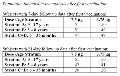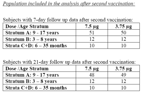Bisher wurde der Impfstoff an 297 Kindern und Jugendlichen getestet. Davon waren 96 Kinder zwischen 6 und 35 Monaten, 100 Kinder zwischen 3 und 8 Jahren und 101 Kinder und Jugendliche zwischen 9 und 17 Jahren alt. Es steht nur die Aufschlüsselung in diese Altersgruppen zur Verfügung.