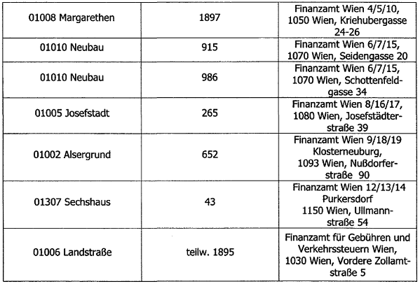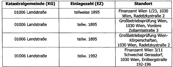 Wie bereits in der Anfragebeantwortung vom 14. Mai 2008, Nr. 3873/AB, des damaligen Bundesministers für Finanzen dargelegt wurde, handelt es sich bei den im Zuge der Neuunterbringung Finanzzentrum Wien Mitte frei werdenden Liegenschaften um nachstehende Objekte: