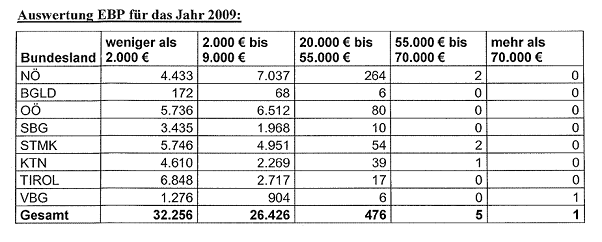 Die Einteilung der Größenklassen zur Auswertung des (Antrags-)Jahres 2009 erfolgte auf Basis der ausbezahlten EBP (Auszahlung im Dezember 2009, Stand der Auswertung Februar 2010).
