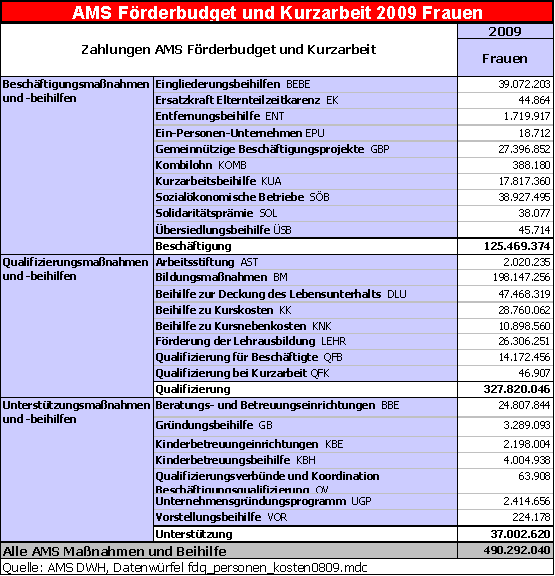 Die zuordenbaren budgetären Aufwendungen für die aktive Arbeitsmarktpolitik inklusive Kurzarbeit für Frauen betragen im Jahr 2009 € 490,3 Mio.
