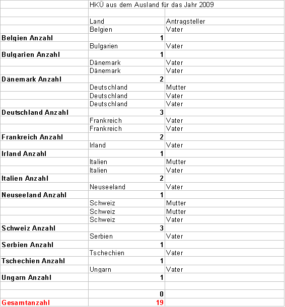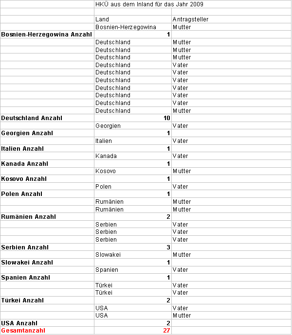 Diese Anfalls-Statistik aller Anträge nach dem HKÜ für das Jahr 2009 (betreffend sowohl die unter Brüssel IIa-VO fallenden EU-MS als auch die ausschließlich nach HKÜ zu beurteilenden Drittstaaten) wurde getrennt nach Anträgen in Österreich wohnhafter Antragsteller in das Ausland (27) und im Ausland wohnhafter Antragsteller nach Österreich (19) erstellt.