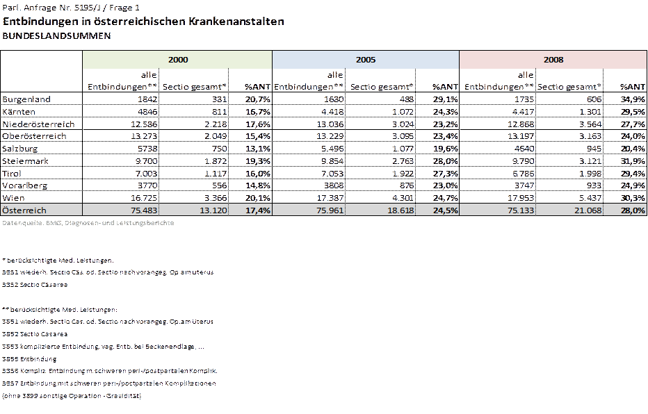 Die Sectioraten aller Krankenhäuser in Österreich für die Jahre 2000, 2005 und 2008 (letzt verfügbare Zahlen) sind der angeschlossenen Beilage zu entnehmen. Die Unterschiede zwischen den Krankenhäusern bewegten sich im Jahr 2000 zwischen 8% und 100%, im Jahr 2008 zwischen 16% und 52%. Österreichweit betrug die Sectiorate im Jahr 2000 17,4%, im Jahr 2005 24,5% und im Jahr 2008 28,0%.