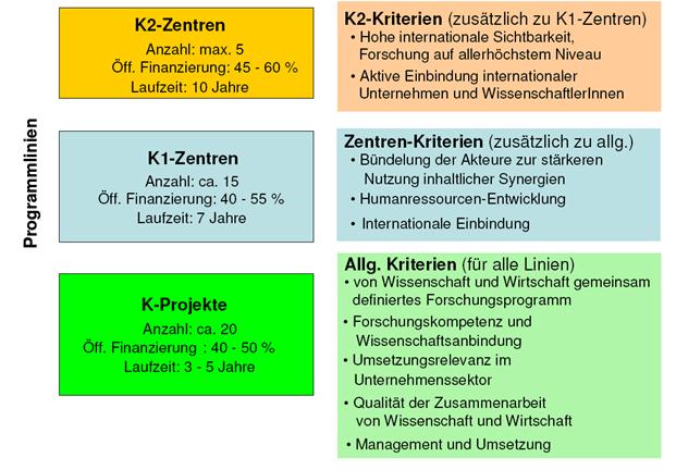 State of the Art u. Neuheit der Forschung, Relevanz der wissensch., technolog. Entwicklung, Marktpotential, Forschunskompetenz u. Verbindung zur Wissenschaft, Relevanz für industrielle Implementierung, Qualität der Konsortien in der Kooperation Wissenschaft/Industrie, Management, Humanressourcenentwicklung, Integration internationaler Partner/innen, internationale Sichtbarkeit