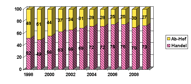 Wie aus oben stehender Graphik ersichtlich ist, konnte der rückläufige Trend des Flaschenweinabsatzes Ab-Hof im Jahr 2008 und 2009 gestoppt werden. Der mengenmäßige Anteil des Flaschenweinverkaufes in Österreich beträgt daher derzeit ca. 27%. Hier muss angemerkt werden, dass es sich um mengenmäßige Verhältnisse handelt, wertmäßig nimmt der Ab-Hof-Verkauf eine wesentlich bessere Position ein.
