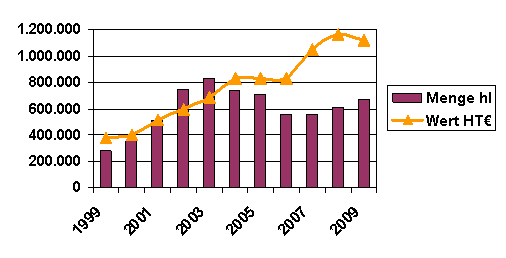 Durch den Rückgang der ab 2000 stark angestiegenen Fassweinexporte ging auch die gesamte Exportmenge zu Mitte des Jahrzehnts wieder zurück, zeigt aber seit 2007 - ebenso wie der Wert der Gesamtexporte - eine sehr positive Entwicklung.