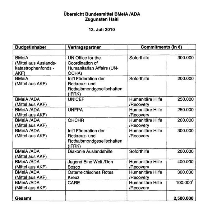 Eine genaue Übersicht über die Verwendung der € 2,5 Mio. plus der € 250.000 des Landes Steiermark ist dem beiliegenden Dokument („Mittel AKF für Haiti“) zu entnehmen.