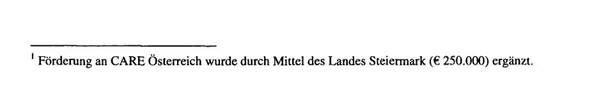 Weiters hat die ADA € 250.000 vom Land Steiermark erhalten und damit ein Hilfsprojekt von CARE (Cooperative for Assistance and Relief Everywhere) finanziert; auch hier wurden 90% der Gelder bereits ausbezahlt.