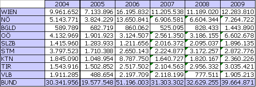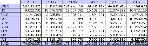 Die Ergebnisse der von Prüfern der Finanzverwaltung vorgeschriebenen Beträge an Lohnabgaben (Lohnsteuer, Dienstgeberbeitrag, Zuschlag zum Dienstgeberbeitrag und Kommunalsteuer) für die Jahre 2004 bis 2009 sind nachfolgend dargestellt: