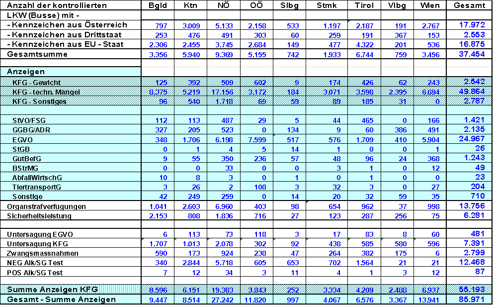 Die beigefügten Statistiken (Beilage 1) geben keine abschließende Auskunft über die Ergebnisse auf den fixen Kontrollstellen, weil nur ein Teil der Einsätze, nämlich jener mit Prüfzügen der Bundesanstalt für Verkehr und der Länder, erfasst wird.