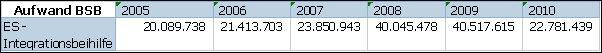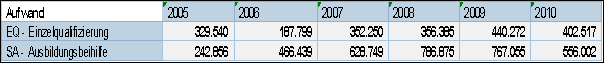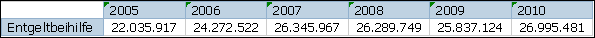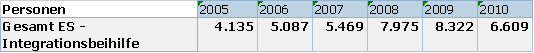 In der untenstehenden Tabelle werden die Zahlungen für Eingliederungsbeihilfen aus dem Arbeitsmarktförderungsbudget des Arbeitsmarktservice (AMS) für die Jahre 2005 bis 2010 dargestellt. Diese Zahlungen entfallen auf Personen ohne Behinderungen, auf Personen mit aus Sicht des AMS sonstigen gesundheitlichen Vermittlungseinschränkungen, auf begünstigte behinderte Personen sowie auf Personen mit Behindertenpass ohne nachgewiesene Begünstigung: